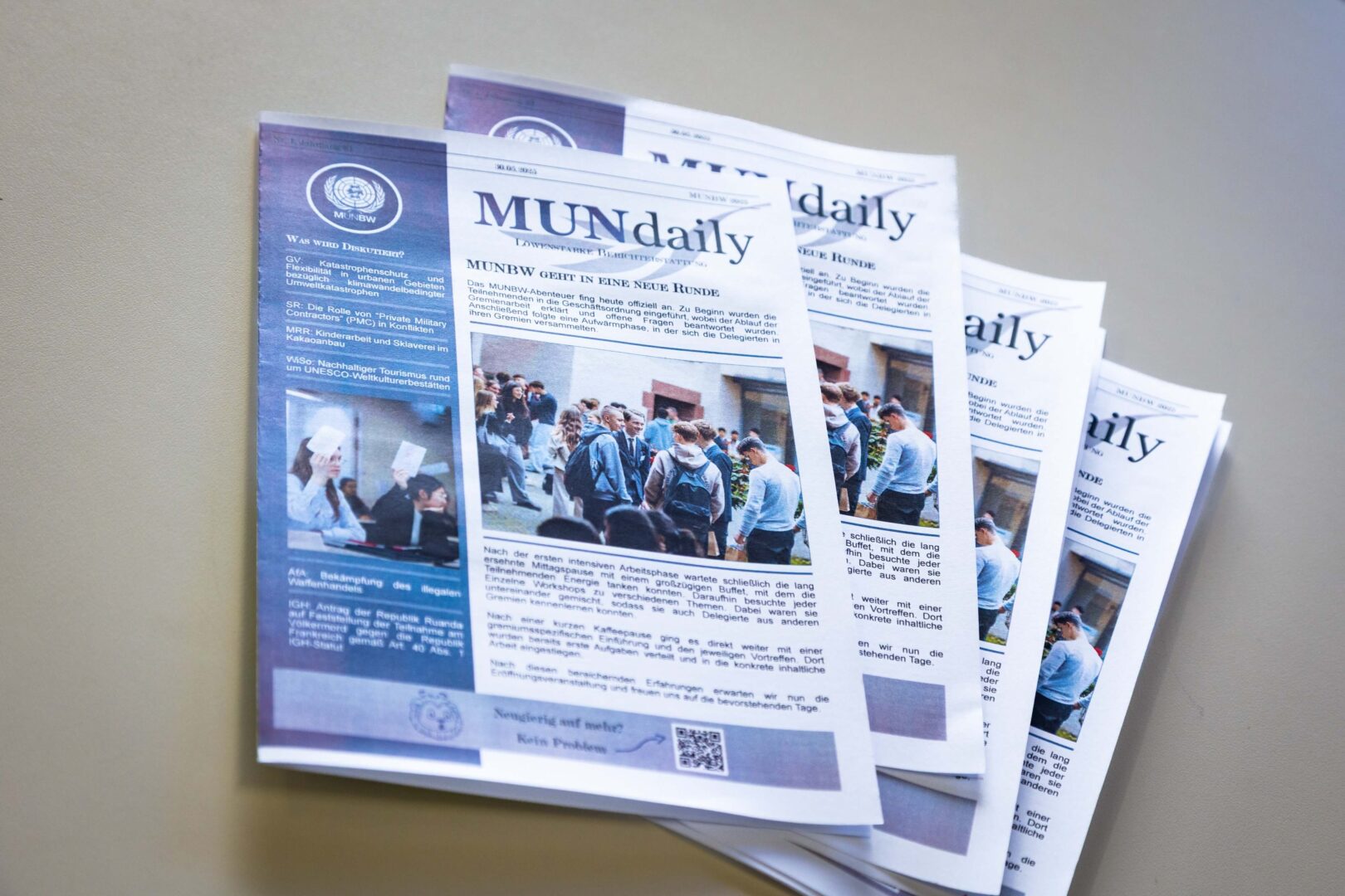 Von Freitag bis Sonntag berichten die Journalist*innen über die Sitzungen der Gremien und des Internationalen Gerichtshofs. Sie schreiben Artikel für die Print- und Online-Ausgabe von mun-daily, führen Interviews mit Delegierten und dem Generalsekretär. Das Fernsehteam produziert täglich eine Nachrichtensendung.